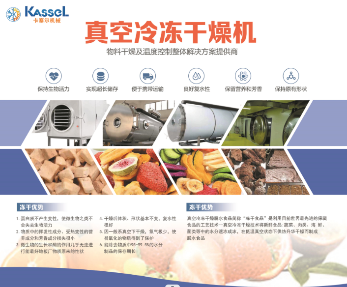 卡塞爾機械(浙江)有限公司為卡塞爾集團成員企業,是一家專業提供真空冷凍干燥設備整體方案的供應商:以“凍干機”為核心產品,形成了針對果蔬、肉類(寵物食品)、速溶方便食品(凍干粉)、美容及生物制品、實驗室凍干、家用凍干及其它等七大凍干產品生產線的針對性解決方案,讓低成本、高效率、多用途的一站式凍干服務成為可能。